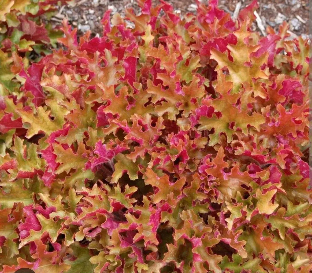 Листья: собраны в прикорневую розетку, крупные, резные, окраска варьируется от оранжевого до золотистого или янтарного, нижняя часть — пурпурно-розовая. Края листьев гофрированные.
