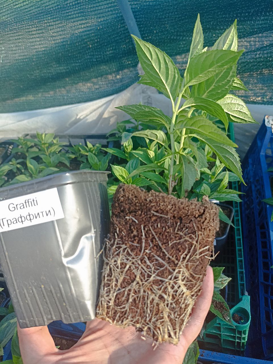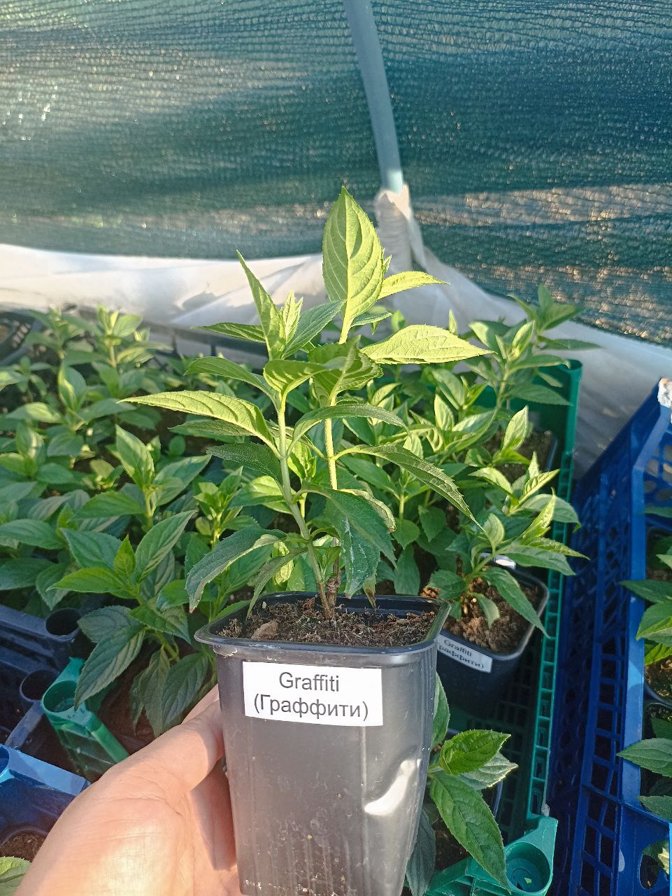 Гортензия метельчатая Graffiti (Граффити) — карликовый кустарник до 1 м высотой и такой же ширины. Побеги жёсткие, прямые. Листья яйцевидные, тёмно-зелёные, с обеих сторон грубо опушенные. Цветки собраны в конусообразные соцветия на верхушках побегов. Соцветия вырастают до 25–30 см в длину, первоначально они светло-зелёные, полностью цветут белоснежными с аквамариновыми верхушками, а в конце лета они розовеют с зелёными и белыми прожилками. Цветение начинается в июле и продолжается до сентября, после цветения цветки высыхают, оставаясь украшением куста в течение осени и зимы. Сорт растёт на умеренно плодородных, влажных и хорошо дренированных, слабокислых почвах, на солнце или в полутени. Предпочитает полутень, но может расти и на солнце. Особенности растения: неприхотливость к внешним условиям и уходу, морозостойкость (в защите от низких температур нуждаются только молодые саженцы), декоративность, возможность выращивания в декоративных горшках.
