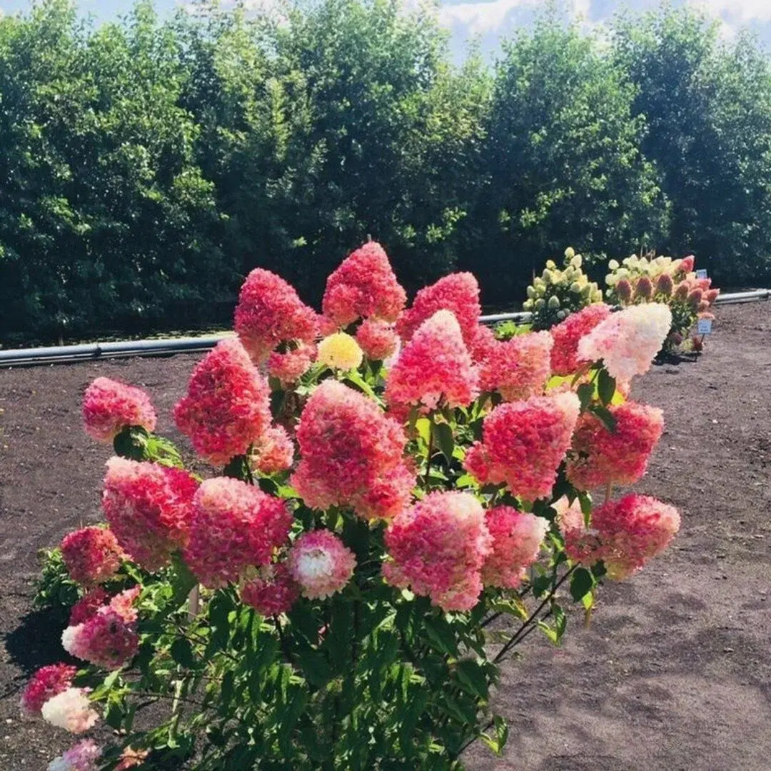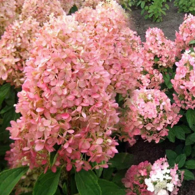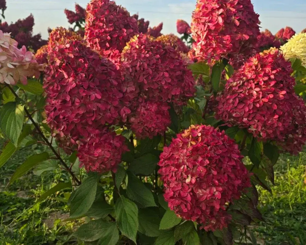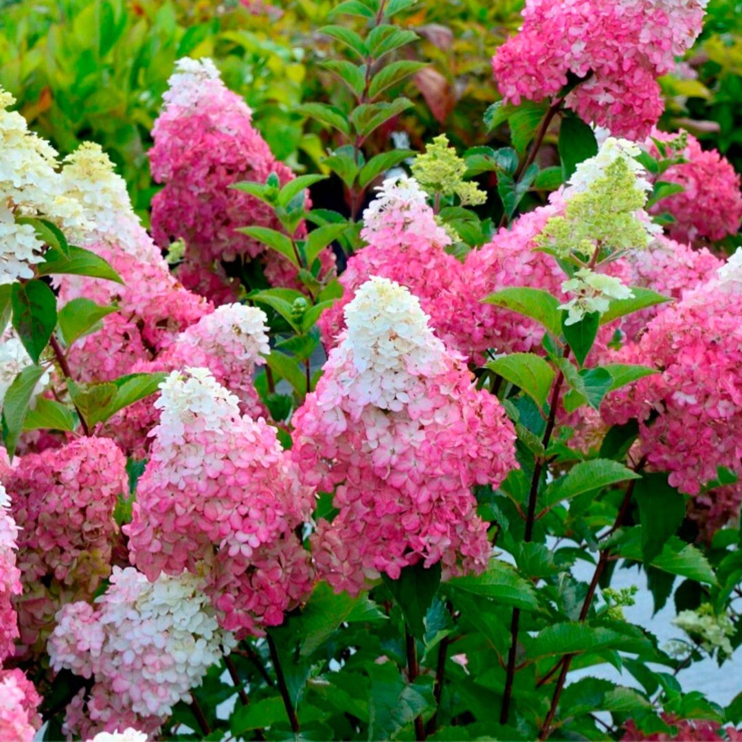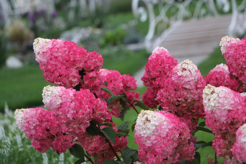 Крупные широкопирамидальные соцветия плотно усеяны стерильными цветками. Окрас цветков меняется во время вегетации: от белого к ярко-розовому, а ближе к окончанию цветения — малиновый.