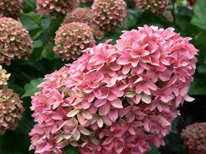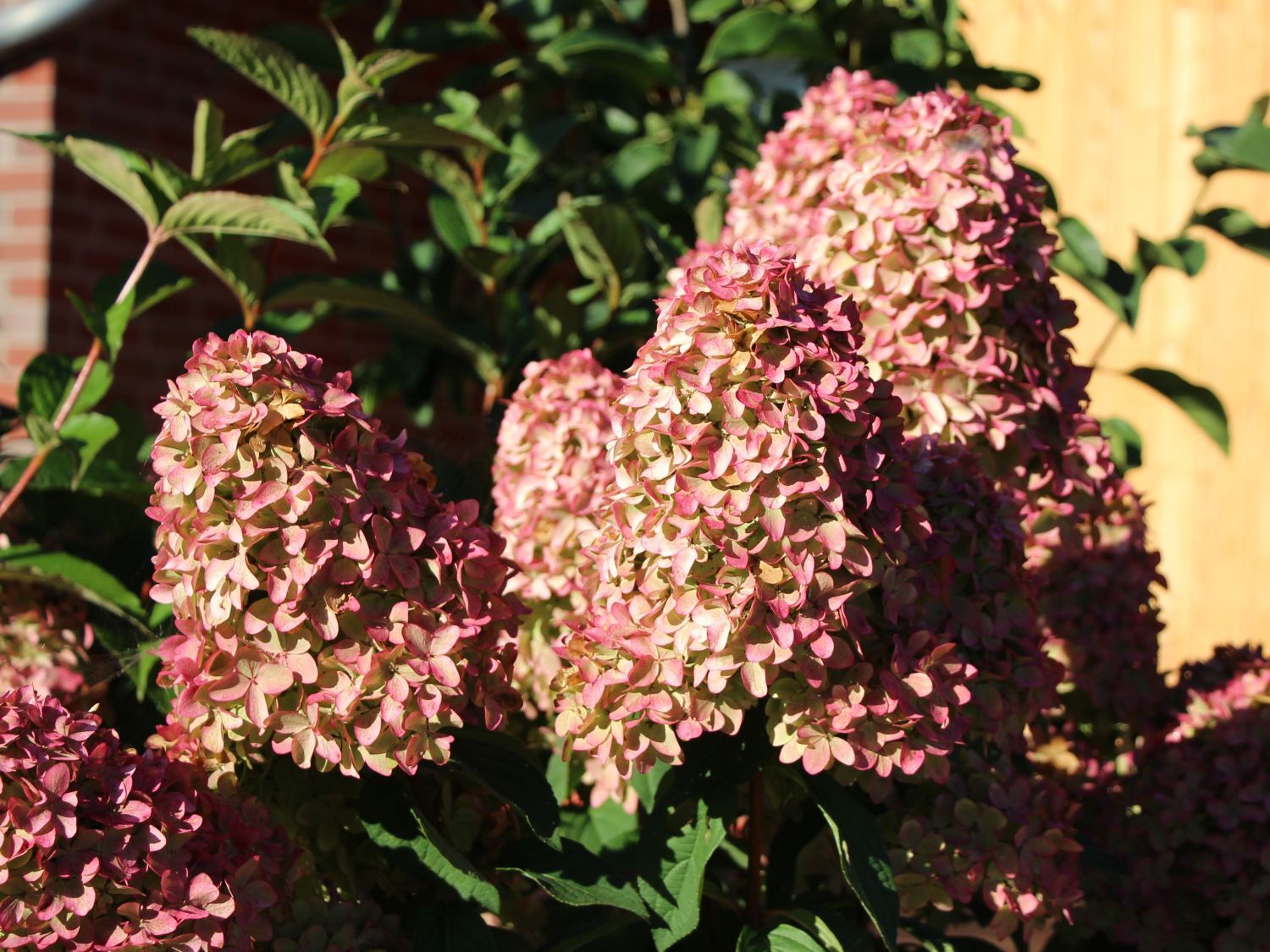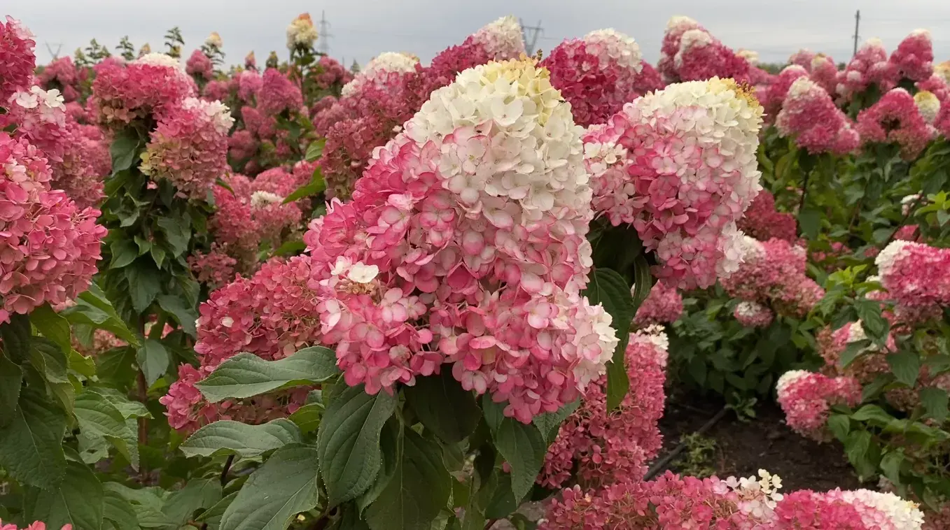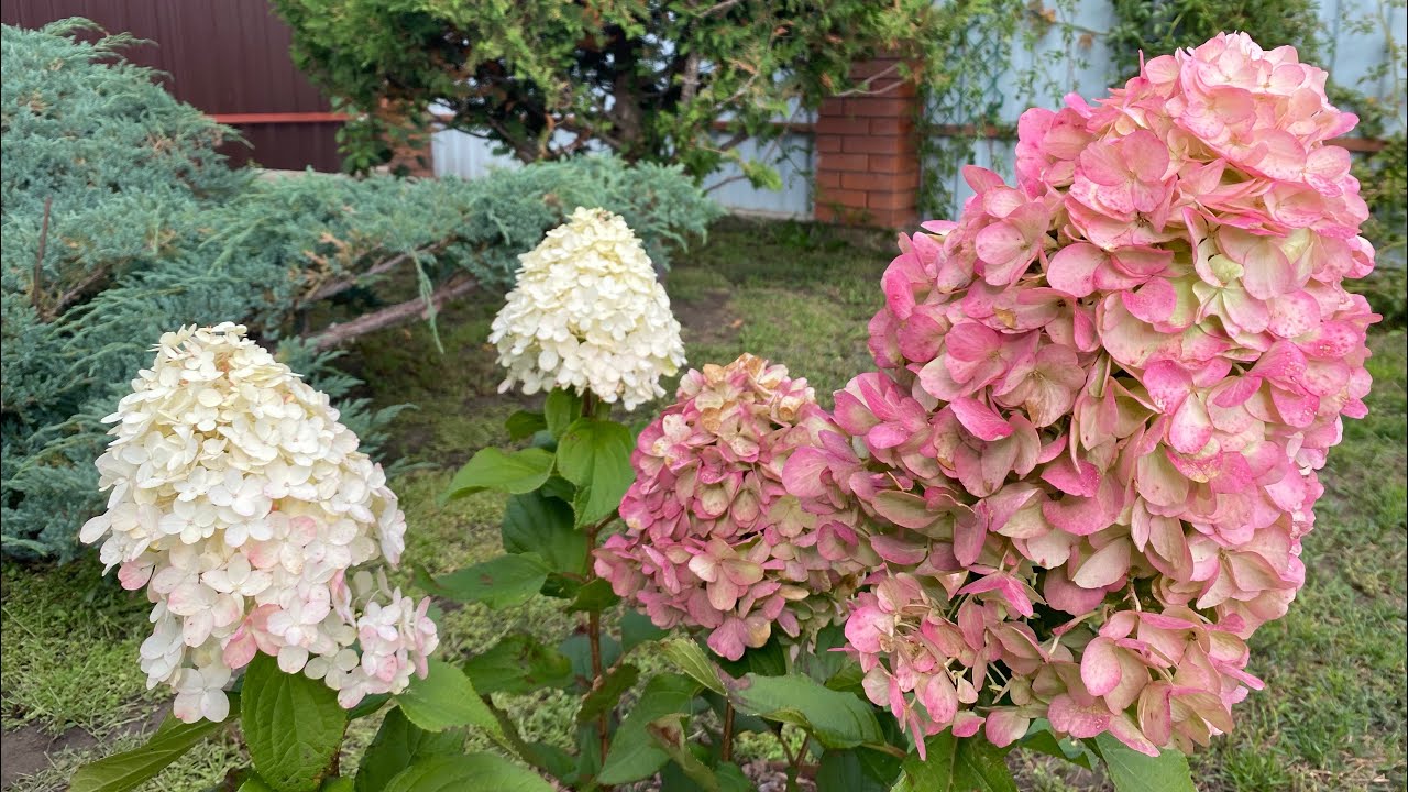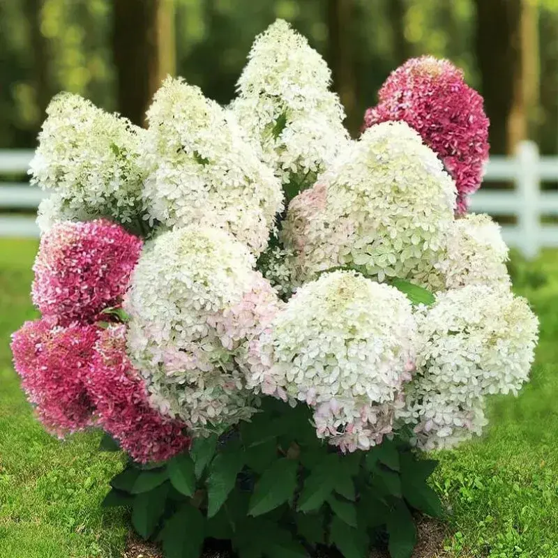 Крупные широкопирамидальные соцветия плотно усеяны стерильными цветками. Окрас цветков меняется во время вегетации: от белого к ярко-розовому, а ближе к окончанию цветения — малиновый.