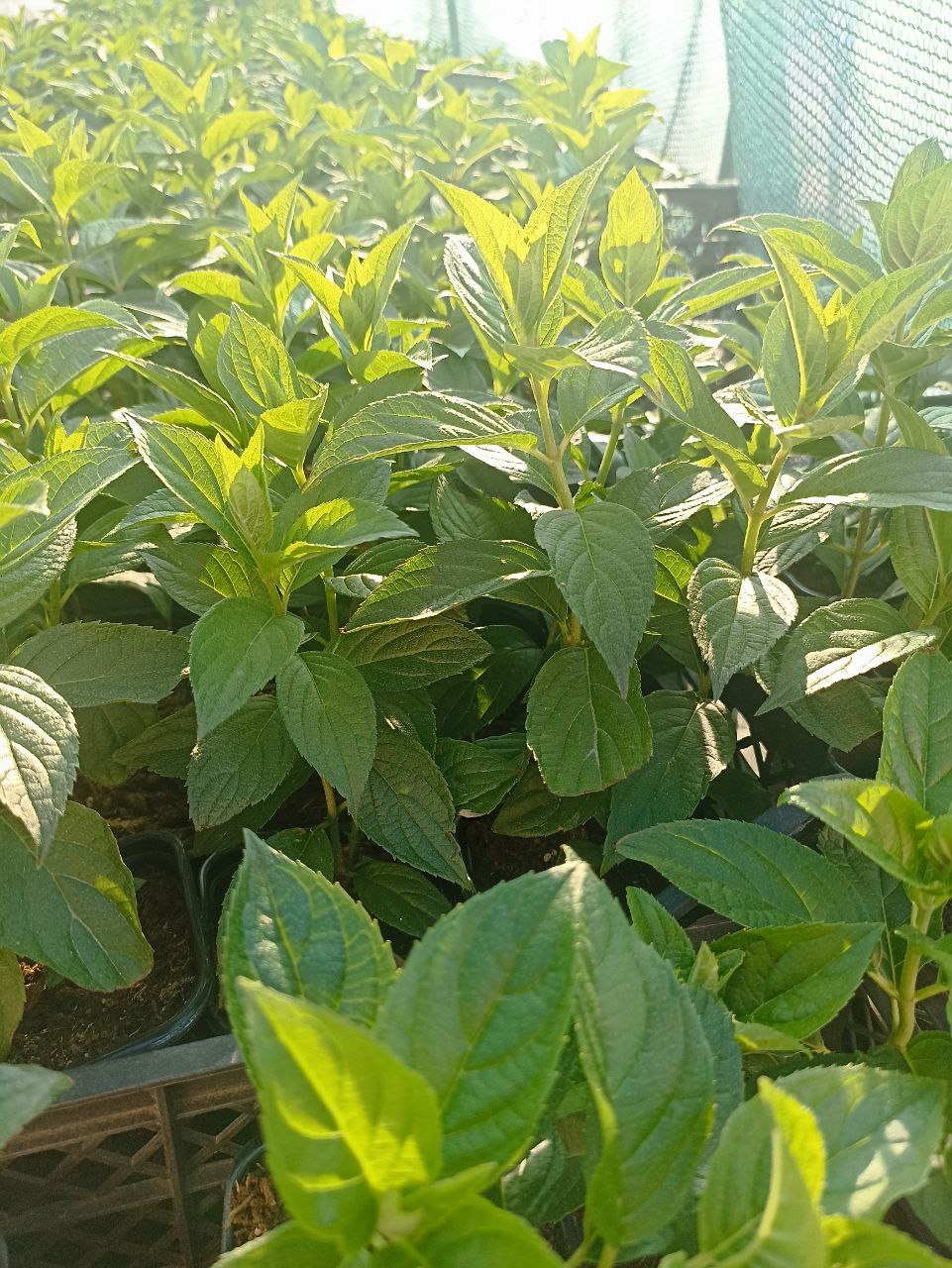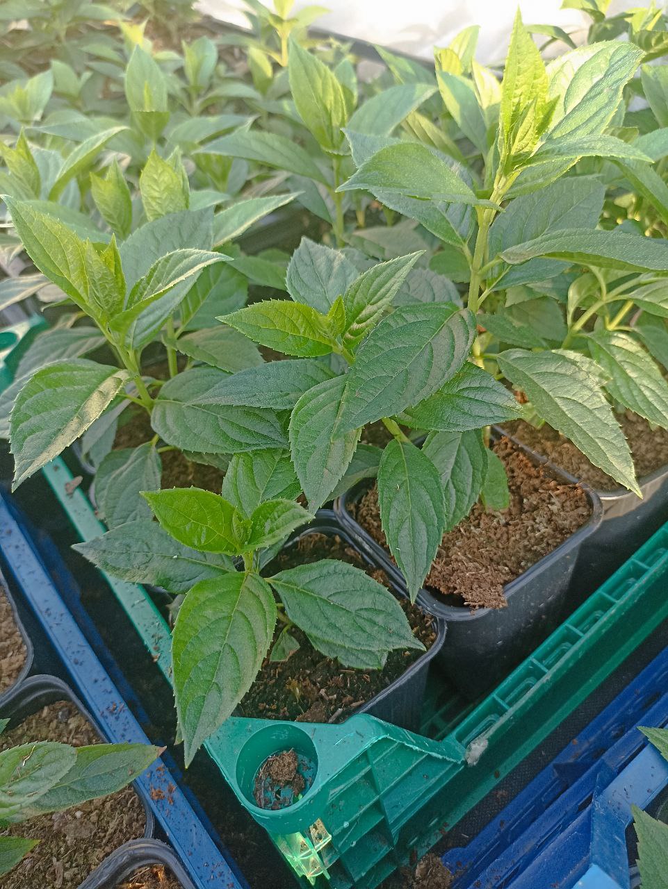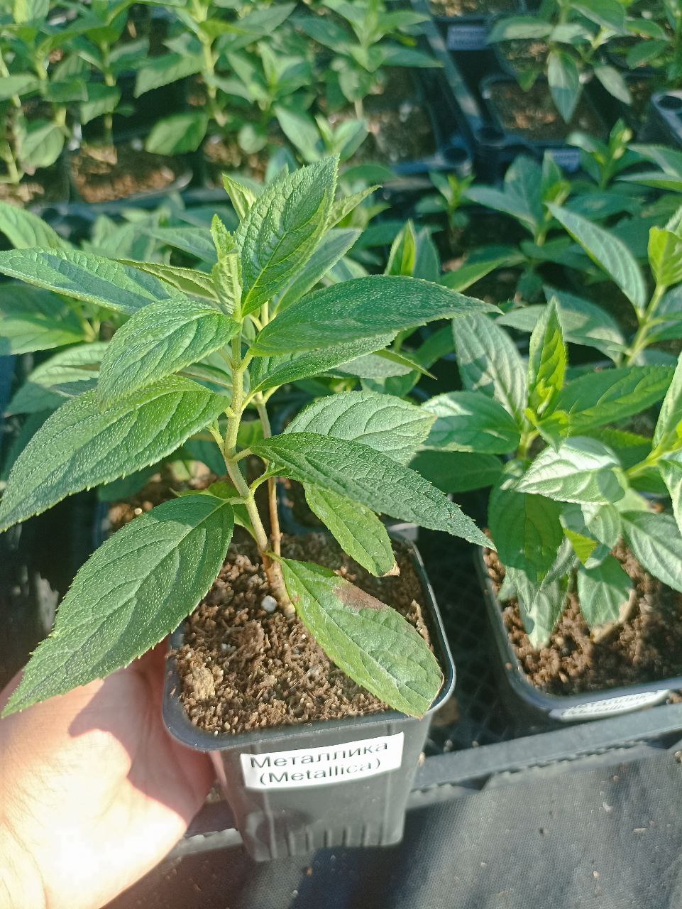 Гортензия метельчатая «Металлика» (Hydrangea paniculata Metallica) — французский сорт от селекционера Жана Рено. Описание: Представляет собой стройный кустарник, который достигает высоты до 1,5 м и ширины до 1 м. Прочные красно-коричневые стебли покрыты крупными овальными листьями. В период цветения, который продолжается с середины лета до осени, растение образует большие (35–50 см) конические соцветия с круглой верхушкой, состоящие из стерильных и фертильных цветков до 5 см каждый. Соцветия сначала белые, затем постепенно розовеют, создавая красивую и нежную цветовую гамму. Финальный окрас — малиновый с характерным металлическим отблеском у лепестков. Морозостойкость высокая (4 зона, до -34 °С). Подходит для одиночных посадок, живых изгородей и групповых композиций. При выращивании рекомендуется высаживать в солнечных местах или в лёгкой тени, выбирать водопроницаемую слегка подкисленную плодородную почву, регулярно обрезать для обильного цветения и активно поливать, но без застоя воды.