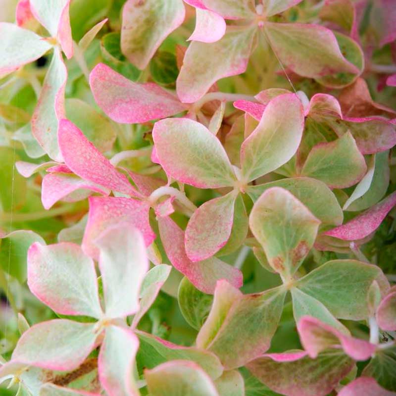 Соцветия: крупные (20–25 см), ароматные, в начале цветения окрашены в арктически-белые оттенки. Постепенно окраина чашелистиков крупных стерильных цветков начинает наливаться розовыми оттенками различной степени интенсивности. Плодущие цветки остаются белыми, с небольшим изменением: снежная белизна смягчается появлением кремового или светло-салатового подтона.