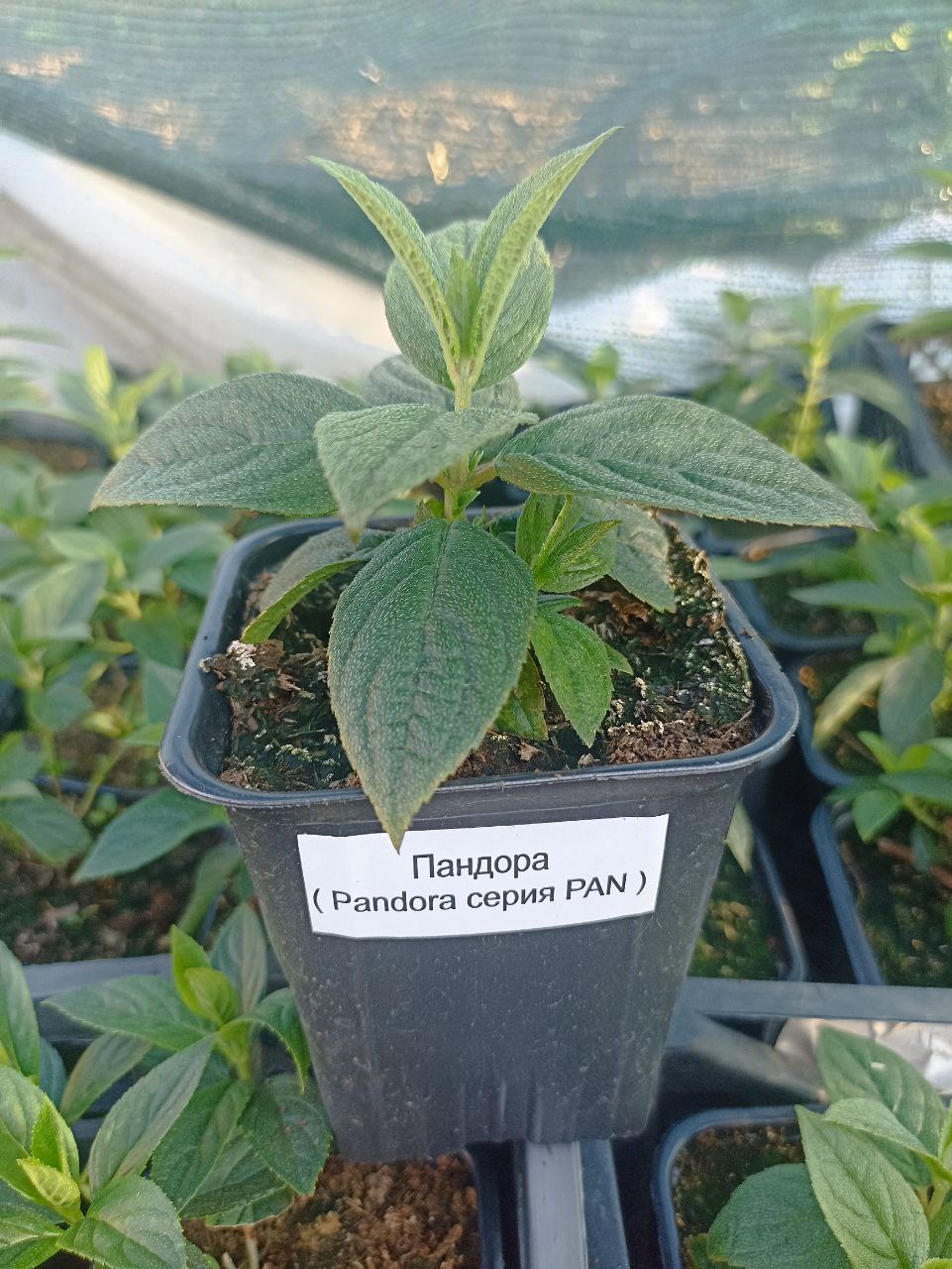 Гортензия метельчатая «Пандора» (Pandora) — новый сорт из серии Pan. Описание: Соцветия: широко конические, длиной 15–20 см. Цветки: стерильные, диаметром 2–3 см, светло-зелёные (лимонно-белые), осенью окрашиваются в мягкий пурпурно-зелёный цвет. Цветение: раннее, в июне-августе. Листва: тёмно-зелёная. Куст: компактный, высотой 100 см. Морозостойкость: до -25 °С. Особенности ухода: Место посадки: просторные, солнечные участки, обязательно защищённые от ветра. Почва: плодородные, хорошо увлажнённые, дренированные, слегка кислые или нейтральные суглинки, или песчаники. Не выносит сильного переувлажнения и застоя влаги у корней. Уход: нечастые поливы, мульчирование, омолаживающая и санитарная обрезка. В регионах с зимними температурами до -25 °С в укрытии не нуждается. Использование: легко вписывается в любой ландшафт. Прекрасно смотрится в одиночных посадках на фоне однотонного газона, солитером, вдоль строений, в групповых композициях. Часто используется как живая изгородь.