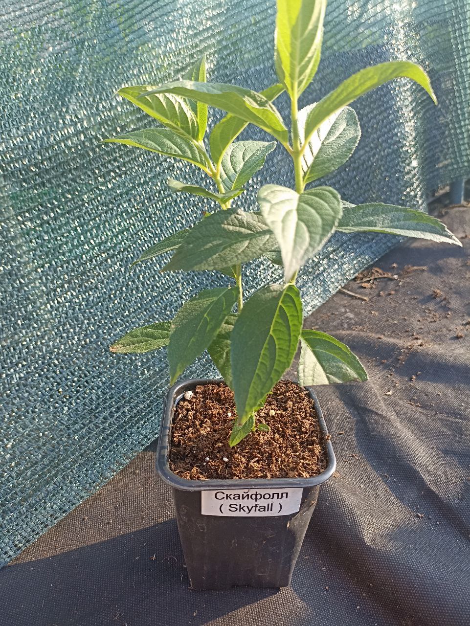 Метельчатая гортензия Скайфолл (Skyfall) — компактный кустарник, достигающий 1,2 м в высоту и 100 см в ширину. Побеги прямые, прочные. Листья яйцевидные, насыщенного зелёного цвета, с зубчиками по краям. Соцветия крупные, 15–20 см, наполнены стерильными цветками, похожими на гиацинты. Лепестки окрашены в снежно-белый оттенок, а со временем становятся светло-розовыми. Цветение с июля по сентябрь. Место посадки: солнце или полутень. Почва: кислая. В ландшафтном дизайне гортензия Скайфолл великолепна в композициях садов непрерывного цветения, прекрасно сочетается с многолетними цветами, отлично смотрится как солитер на газоне. Уход: обильные поливы, рыхление или мульчирование, подкормки в период роста побегов и в фазу формирования бутонов.